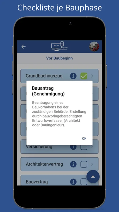 Unterstützt als Leitfaden in den einzelnen Bauphasen. Info-Texte erläutern Dir die Themen und Du kannst Deinen Fortschritt mit Checkboxen festhalten. Mach als Bauherr & Bauherrin den Haken dran.