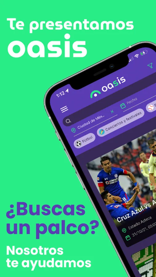 Oasis es una aplicación especializada en la renta de palcos de estadio y asientos VIP para cualquier tipo de entretenimiento, ya sea corridas de toros, fútbol, tenis, conciertos, Fórmula Uno y demás. La aplicación Oasis esta diseñada para tener presencia en todos los recintos de México, siempre y cuando estos recintos cuenten con asientos preferentes como lo son palcos enteros o compartidos, asientos VIP o plateas.