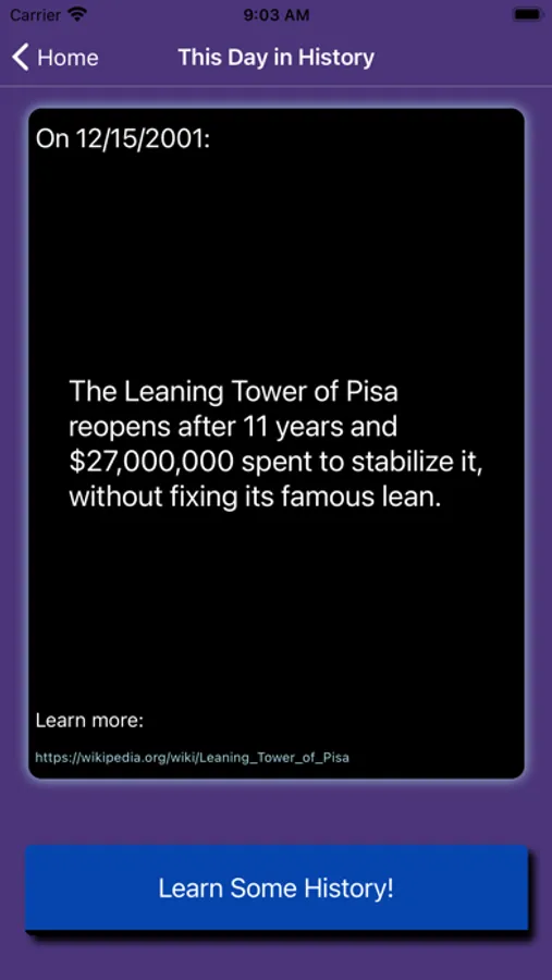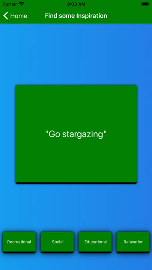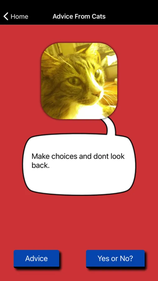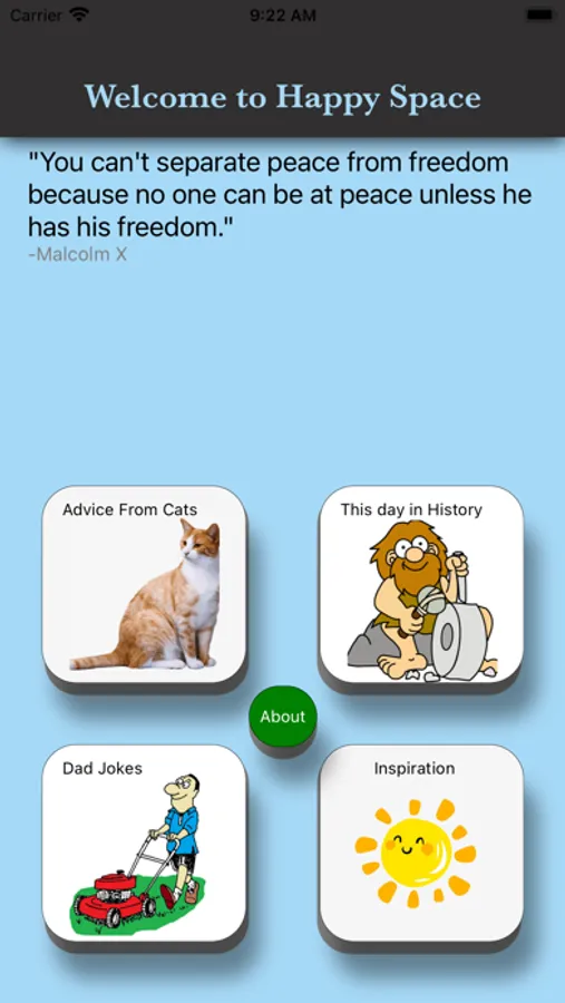 This app is designed to create a happy space for the user to see what events happened on this day in history, look at a dad joke or two, discover some inspirational ideas, or get some advice from cats.