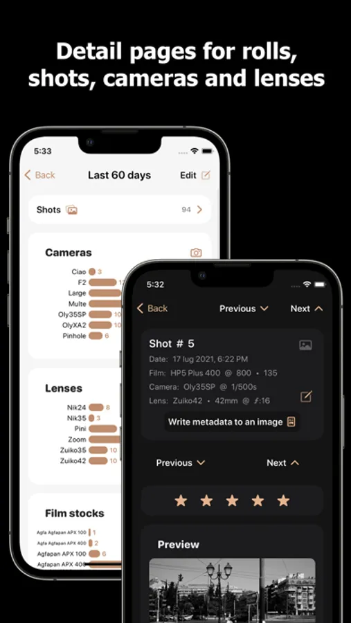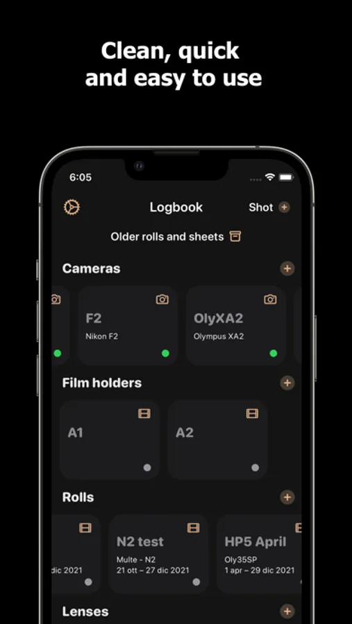 Lightme - Logbook is a clean and powerful tool to record and keep track of your rolls and shots, as well as other gear and consumables (soon! :) ) that revolve around the process of shooting and developing film.
