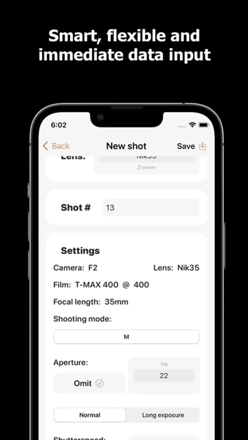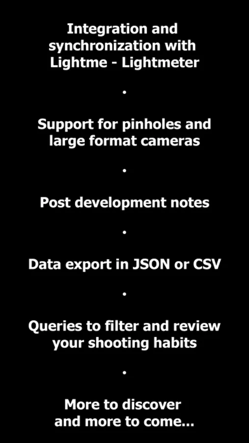 • Post development notes for rolls, sheets and shots, also allowing to add a further photo to record also the final results.