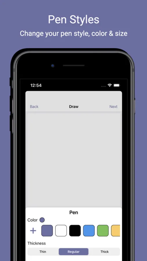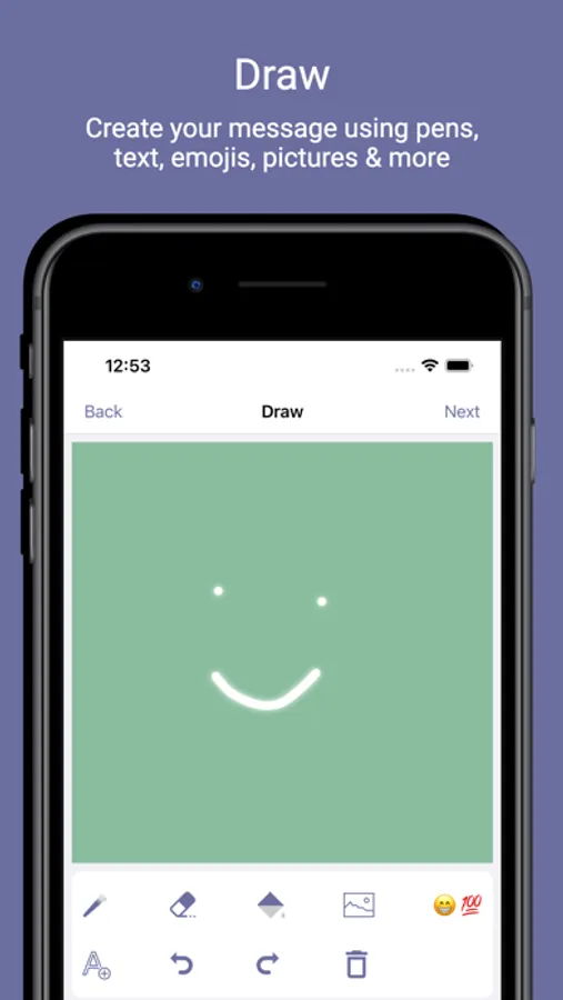 When drawing in Whiteboard, you can select from a variety of pen styles, thicknesses and colors. You can even pick your own color and save it to your presets for later! We offer a variety of backgrounds that you can add to your messages, or you can select a photo from your library/camera. Also don't forget to add some text and Emojis! You can always save a message to your draft to continue drawing it later.