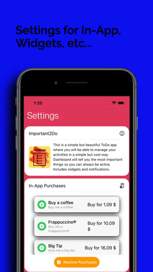 This is a simple but beautiful ToDo app where you will be able to manage your activities in a simple but cool way. Dashboard will tell you the most important things so you can always be active. Includes widgets, notifications and iCloud sync.