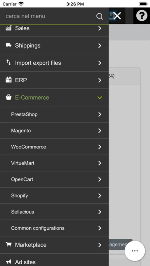 ECOMMERCE groups all the items relating to the processes that can be executed from and to the integrated eCommerce platforms, divided by type of CMS. For each eCommerce platform there are the related specific items.