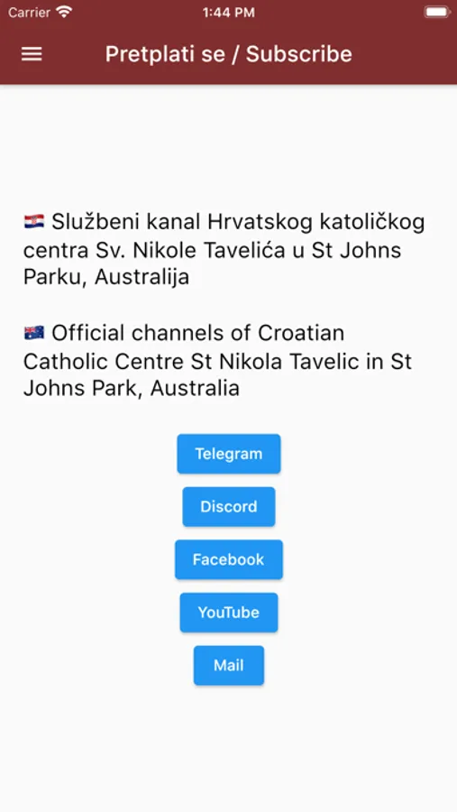 Ability to see all the official channels of St Nikola Tavelic in St Johns Park, Australia including Telegram, Discord, YouTube, FaceBook and Email.
