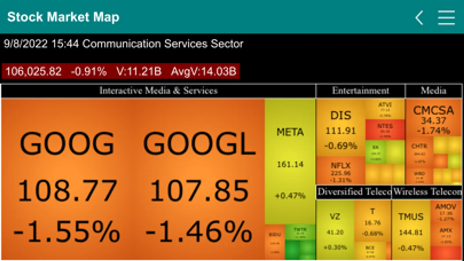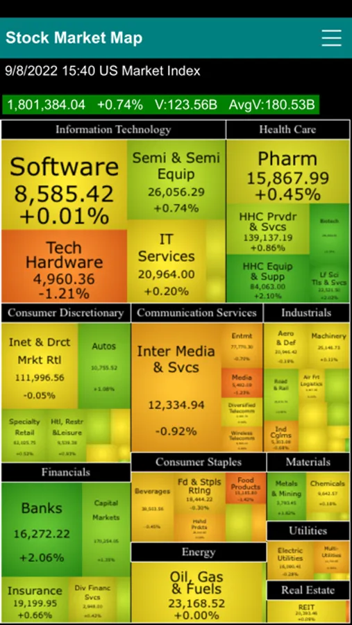 Stock Market Map (a.k.a. market heat map or market tree map) is a visual representation stock market data. This specific map categorizes 600+ stocks and ADRs with largest cap. into sectors and industries. Top-level map consists of sectors of the entire market and all the industries under each specific sector. 2nd-level map starts with a sector and includes all industries and individual company stocks under the industry. It lets you quickly view the performance of sectors, industries and individual companies. The size of the block in the map represents the values of the component (stock or industry) within the portfolio of its parent (industry or sector). The color of the block represents the daily price movement of the component. The overall performance of the entire stock market and/or individual sector can be easily grasped by a glimpse to the map by the color and size of the blocks.