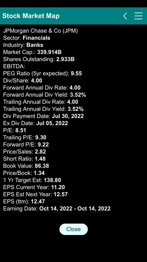 Company fundamental data include Market capitalization, outstanding shares, EBITDA, PEG Ratio, Dividend per share, forward and trailing dividend rate and yield, dividend payout date, ex div date, P/E, trailing and forward PE, price/sales, short ratio, book value, price/book, price target, current and forward EPS, EPS report date, EPS ttm, Basic EPA, Diluted EPS, High/Low EPS estimation, number of analysts.