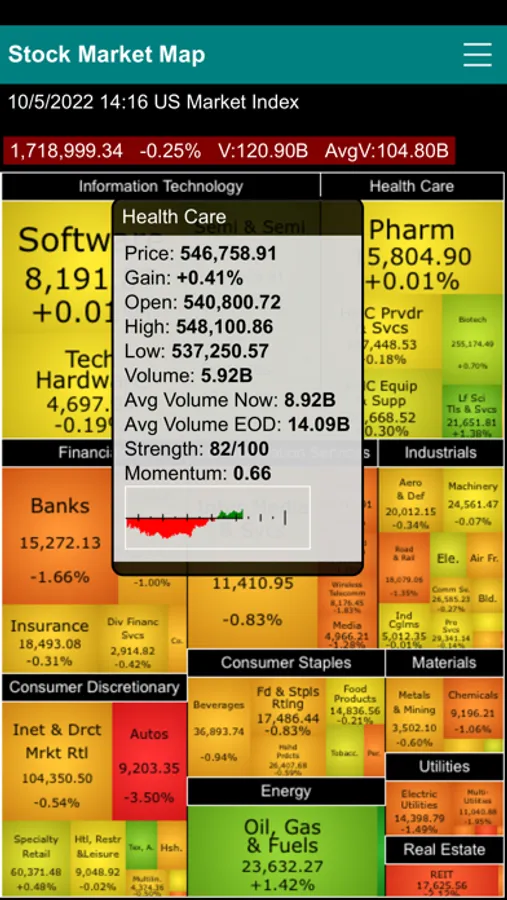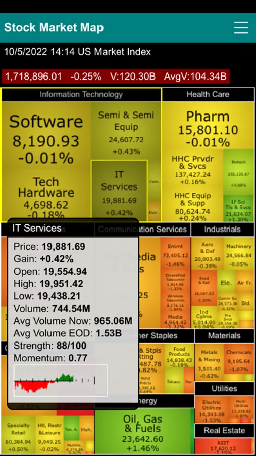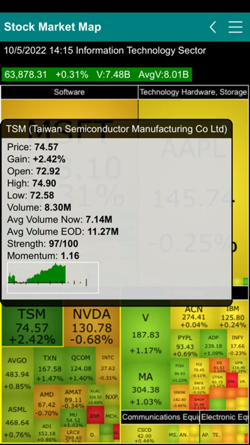 Tapping a block brings up a popup box showing the name, daily closing price, daily gain, daily volume and the 13 week average volume of the sector, industry or individual stock. For stocks there are also the strength and momentum data tracking the short-term strength of the stock compared to other stocks in the market as well as the volume momentum of the price movement. The name of each component is labeled on top of each block. Double tapping any block from the top-level map navigates to the second-level map of the sector that the block belongs. Tap the back button on the title bar or the back button on the mobile device to navigate back to the top-level map.