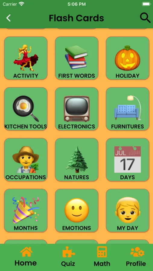 - Learn different emotions, occupations, furniture, transportations,different musics, different sports, foods, kitchen tools, electronics, landforms, holidays etc..