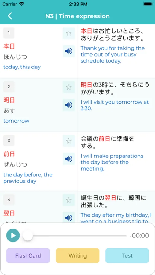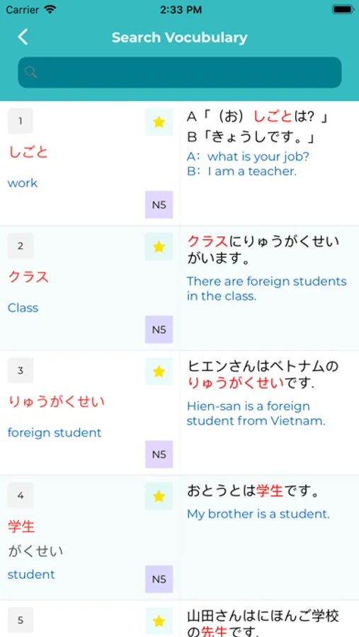 This application provides you with 10000 vocabulary from N5 to N1 with many useful features for learning and practice. Audio files are also provided with words and examples to help you practice listening at the same time conveniently