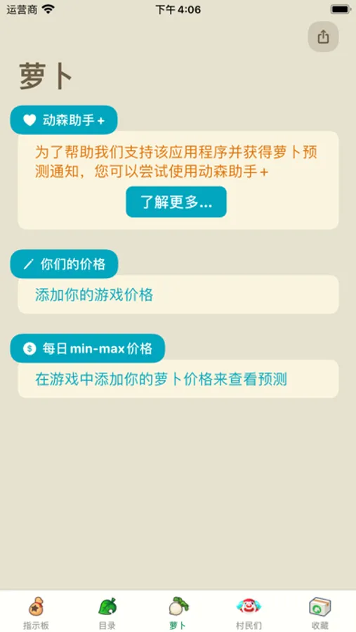 - Turnips: The app have a built in prices predictions algorithm, once you'll have added your Sunday buy price and Monday first price from your in game store the application will start to make daily predictions. The more prices you add during the week the better it'll be.