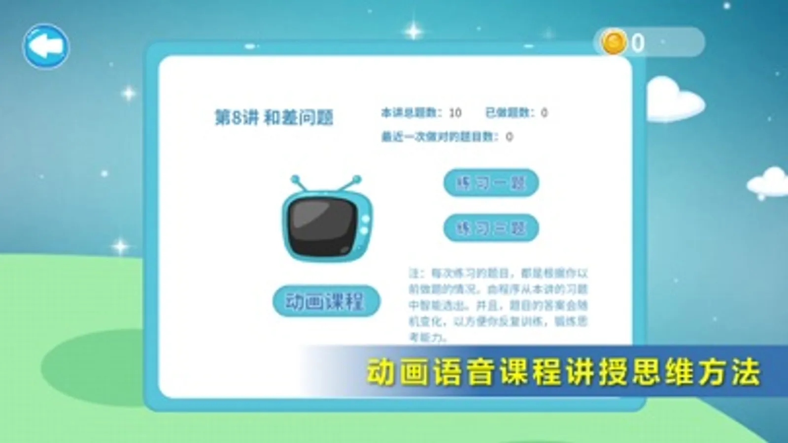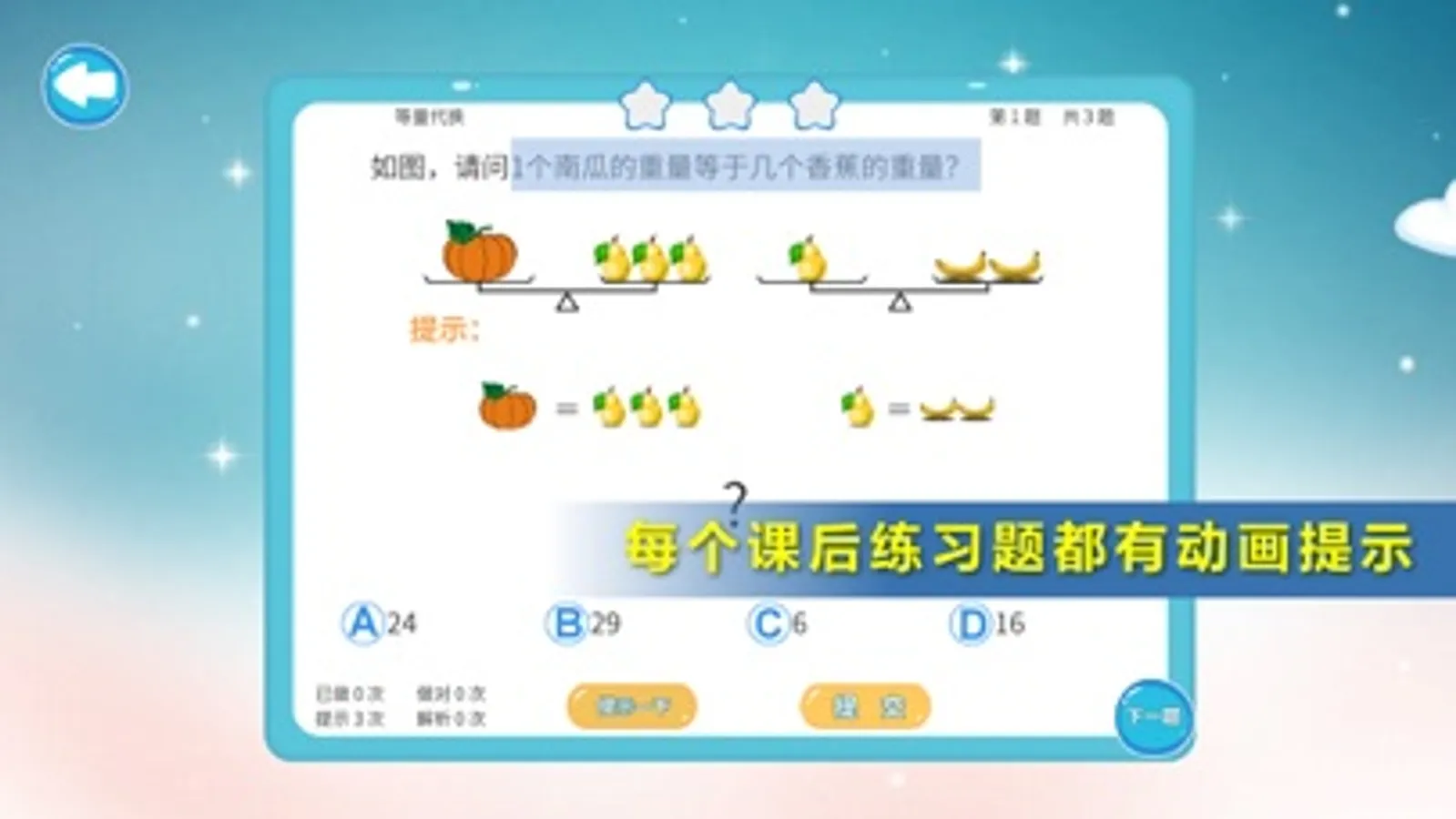 每一个课后练习题,都配有动画语音提示,在孩子不会做的时候,先给点提示,以启发孩子的数学思维,帮助孩子养成热爱思考的习惯。提交答案以后,系统会自动批改,然后给出详细的动画语音解析和完整的正确答案。每次练习的题目,都是根据孩子以前做题的情况,由程序智能选出。没做过的,不会做的或者是做错的,将会优先推送给孩子。并且,每次题目的答案都会随机变化,以方便孩子反复练习。