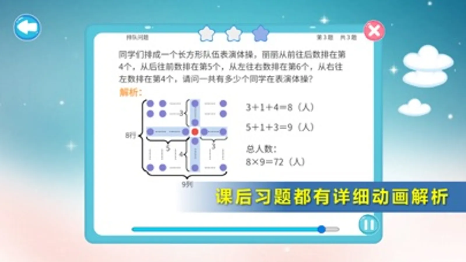 为了让孩子更好地锻炼数学思维,所有课程都采用动画的形式,由名师进行详细地语音讲解。为了和孩子更好地互动,每个例题都会自动暂停,先让孩子自己思考,然后才开始讲解。