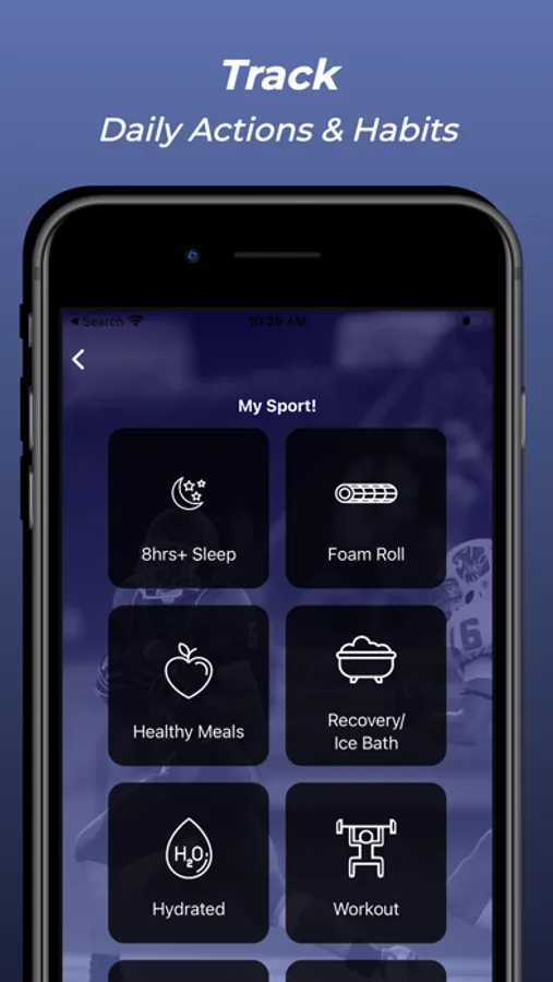 * _My Sport_: actions include Stretched, Extra Workout, P.L.I.O.s, Hyrdated, Healthy Meal, Visualized, and more.