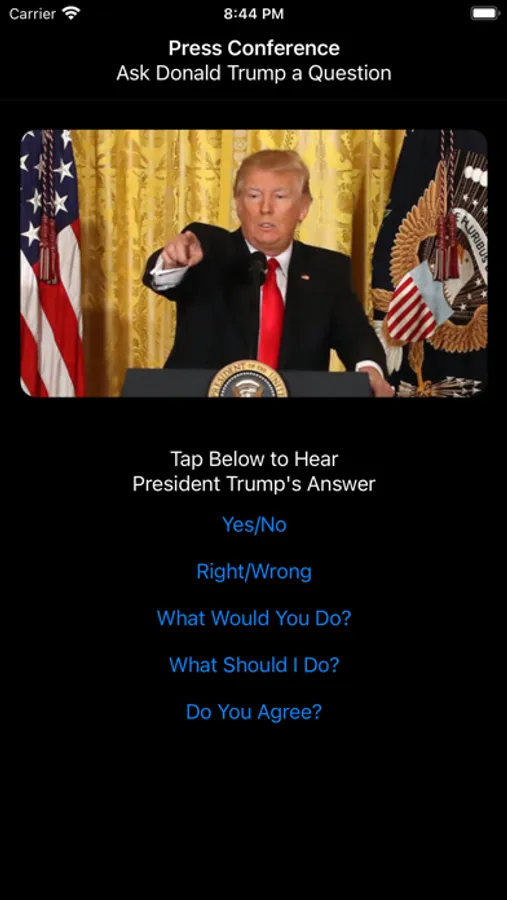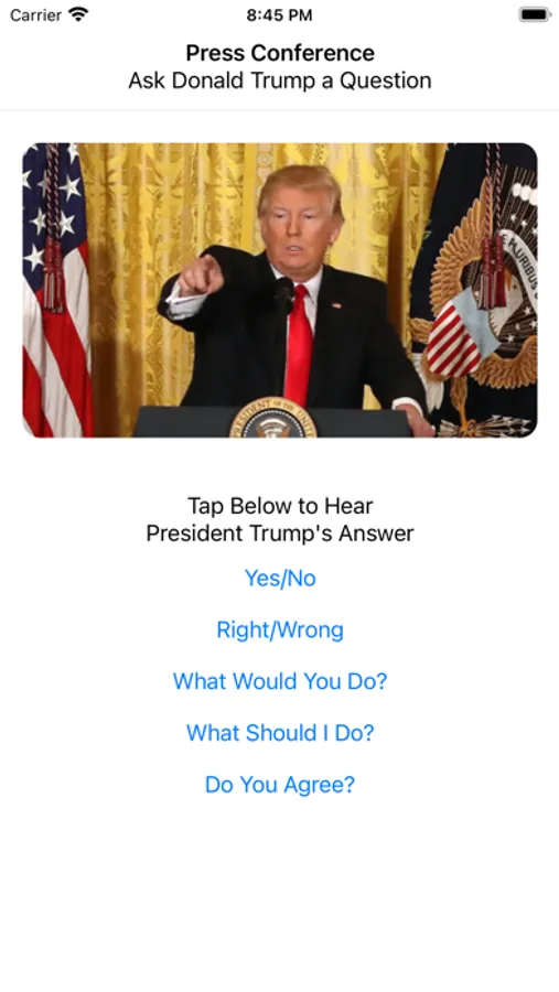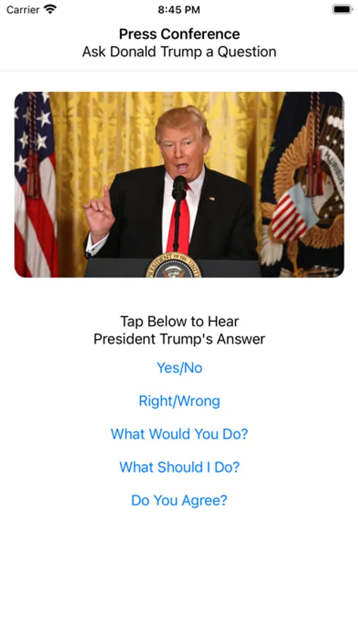 Ask President Trump any question. Over 50 hilarious answers in Trumps own voice. Discard your Magic 8 Ball and hold your own personal press conference. Whether you're a Democrat or a Republican, you will find this app hilarious. If Trump won't answer your questions on Truth Social, try asking him here!