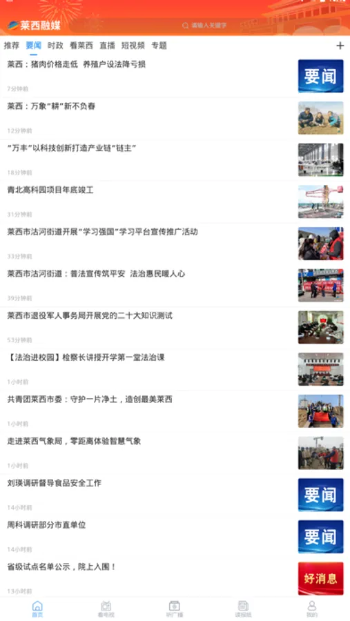莱西融媒app是莱西市融媒体中心重点打造的新媒体传播平台。集电视视频、新闻资讯、政务信息、社会热点、生活服务等于一体,用户可以在平台上享受电视广播直播、点播和回看服务,阅读电子报纸、参与直播互动,满足随时随地观看电视、了解信息、互动爆料的需求。