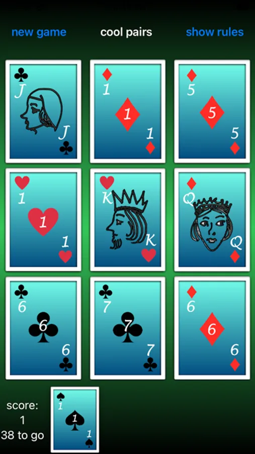 You may tap any card on the deck. If the card immediately to the left of it, or the one next to it (ie you may jump one), is of the same suit (hearts, diamonds, spades and clubs) or the same value (1, 2, 3, 4, 5, 6, 7, jack, queen, king) when you tap it the second card you tapped will disappear from the deck and will be placed at the bottom of the screen in a scrollable carousel.