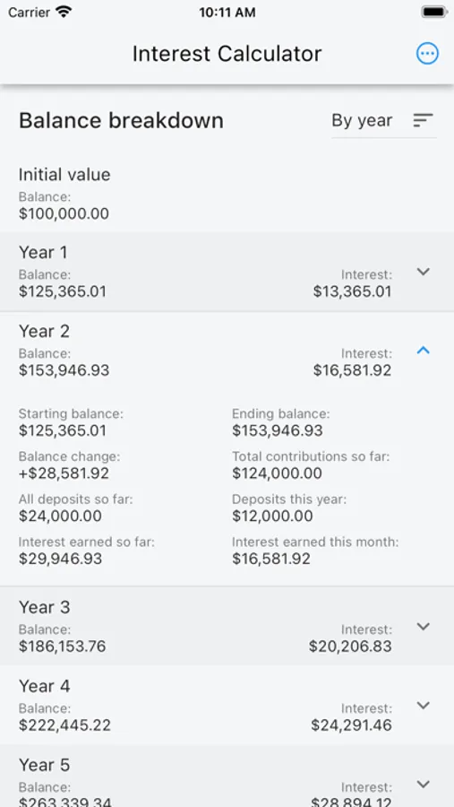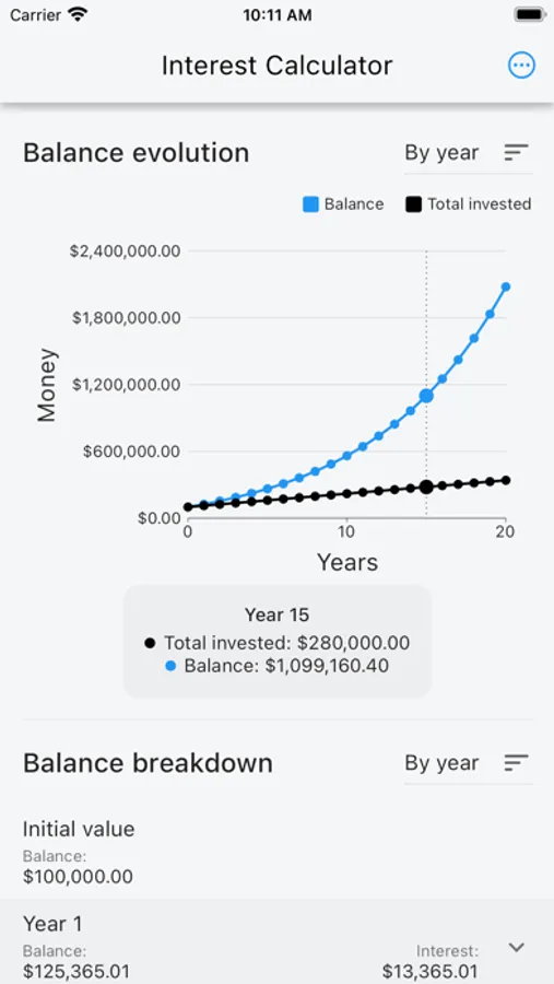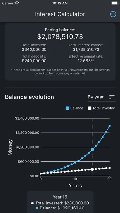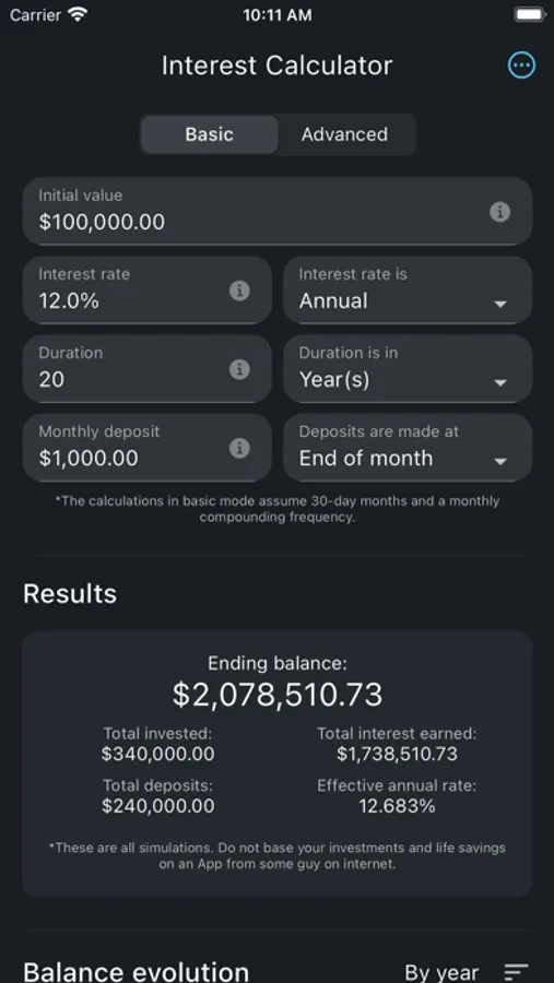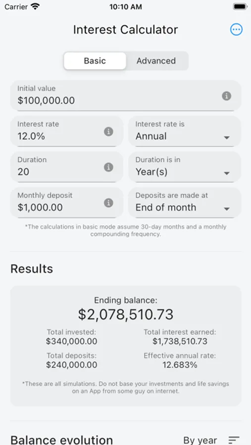 Getting started with the "Basic Mode" is easy: Just input the initial amount of money (if any), an optional monthly deposit, the interest rate and how much time you are planing to keep your capital invested. This app will then show you all the information you need in a beautiful graph, accompanied by a detailed analysis for the selected period.