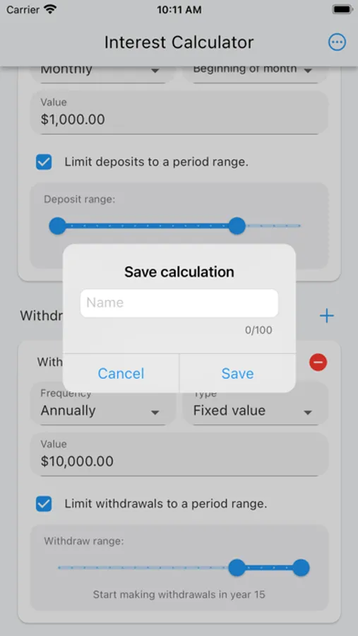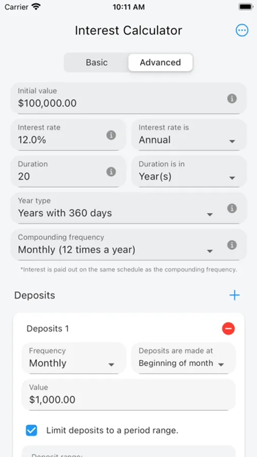 For more customization, the 'Advanced Mode' offers additional features: You can add multiple deposits and withdrawals over time, choose different compounding frequencies (such as daily or quarterly), and adjust the number of days in a year. For example, you can simulate a scenario where you make significant monthly deposits for 30 years, and then begin making annual withdrawals of a percentage of the balance. This calculator is that flexible.