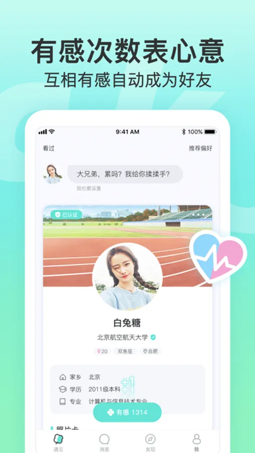 三、有感。如果你希望认识TA,就可以毫无压力的点击有感,对方并不会知道,如果双方互相有感则会自动成为好友。最多可以对一个人有感1314次,有感次数可以表达喜爱的程度。