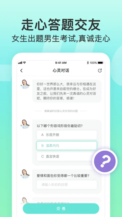 二、答题交友的机制。为了保障同学们可以真诚走心的去认识别人,我们提供了一种答题交友的交互机制,每个人都需要设置一套自己的试题,如果想认识别人,需要回答对方的试题,答题通过后双方才能成为好友自由对话。通过答题考试的形式实现一种精神层面的深层次交流,筛选交友对象,减少无用社交,提高社交的效率。