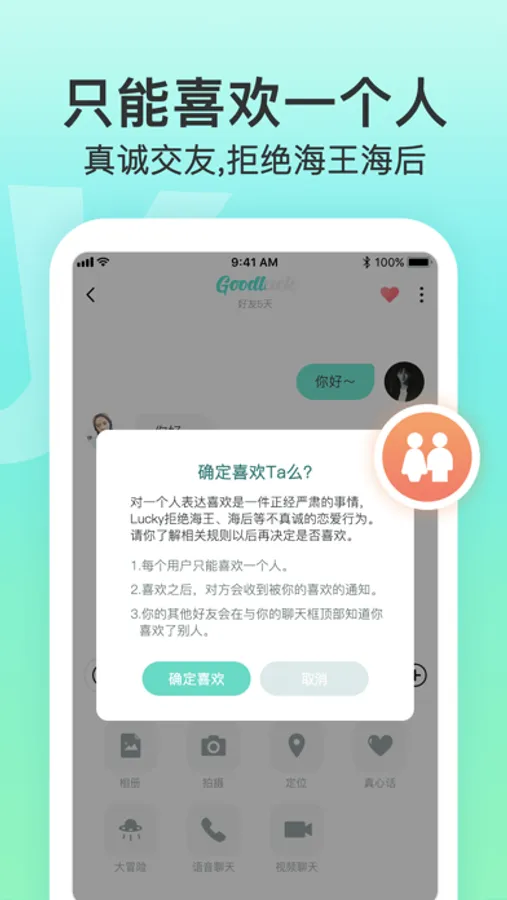 四、每个人只能喜欢1个人,拒绝海王海后等不真诚的恋爱行为。一旦点击了喜欢,对方会知晓你的心意,同时你的其他好友也会知道你已经喜欢了别人。我们不欢迎任何形式的与多人保持暧昧的恋爱行为,希望每一次喜欢都是源自真心。