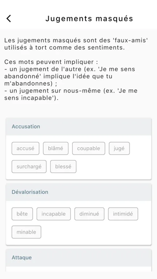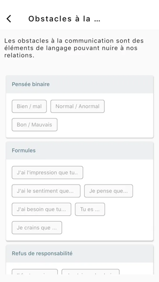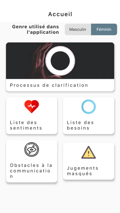 Cette application vous aidera clarifier vos observations, vos sentiments et vos besoins afin d'exprimer au mieux vos demandes. Elle vous permettra aussi d'identifier les obstacles à la communication et les jugements masqués.
