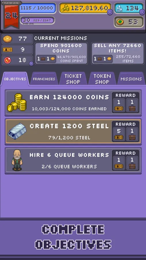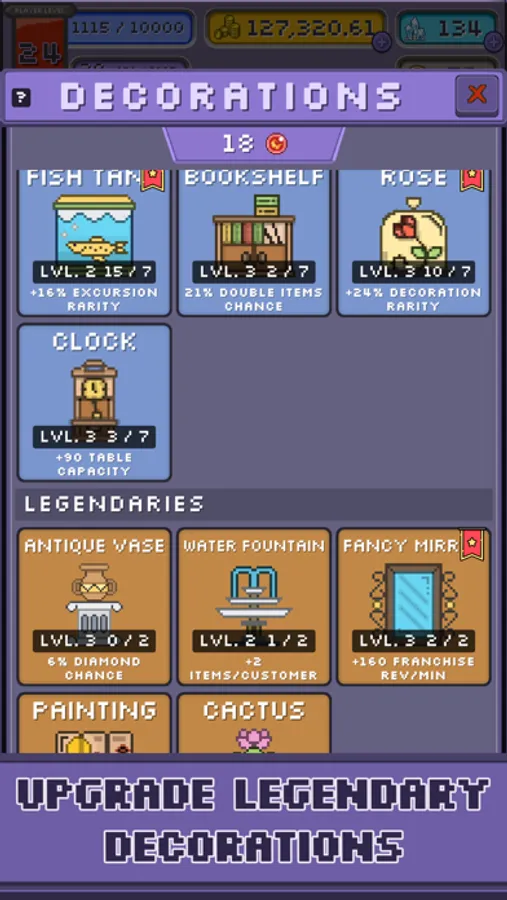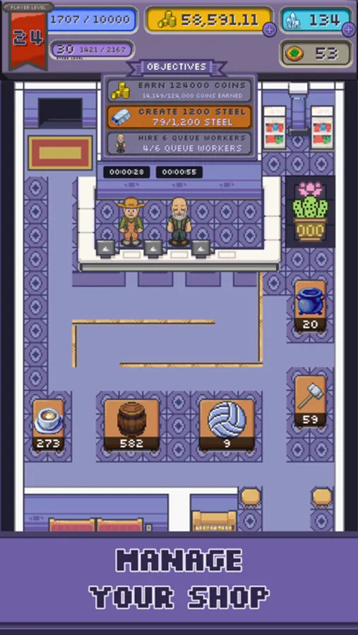 Keep your business on track by completing objectives and missions for your store. You’ll be able to collect great rewards, including new legendary workers and legendary decorations, which will propel you into riches. Upgrade your workers and improve your decorations to keep your shop running smoothly.