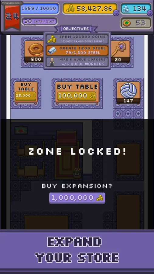 Your store starts out small, but as you earn more coins you can expand the size of your store as well as buy more tables to stock items. Make sure your tables are always stocked so that customers can spend their hard earned money at your store.