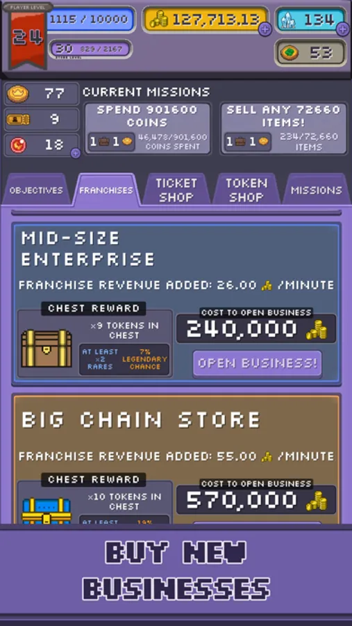 Franchise old businesses to improve profits, get passive income, and reap great loot. Every business that you grow from the ground up can then be franchised off to improve your future businesses. You’ll also unlock new upgradable items that improve your business even further!