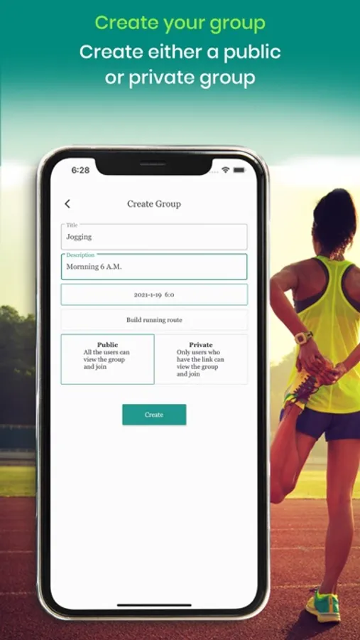 * Public group- Next comes the option of making your group either private or public. The public group will allow anyone using the app to view and join the running group.