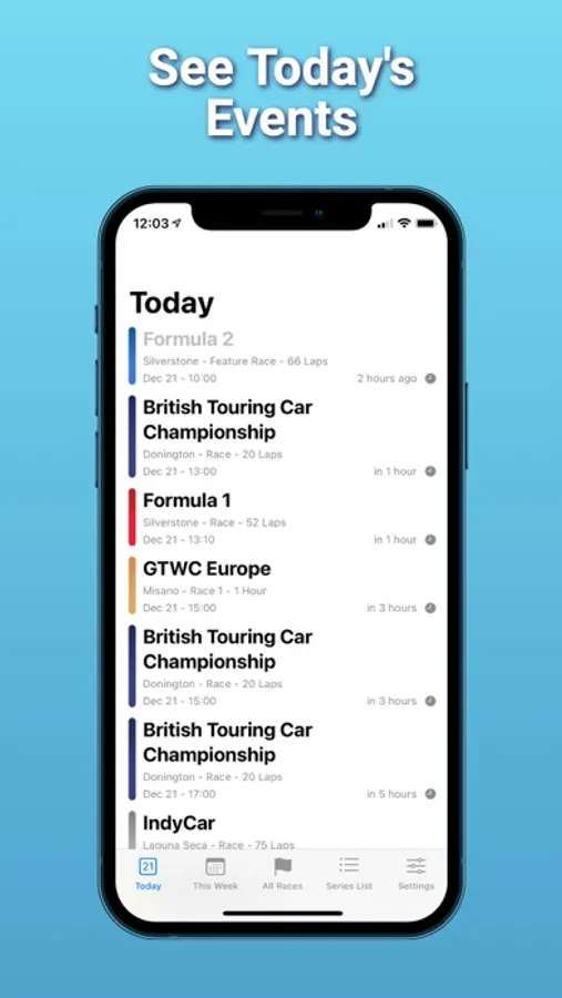 - TODAY VIEW: Get a quick glance at all the races happening on any given day. Don’t miss any of the action and plan your motorsport viewing ahead of time.