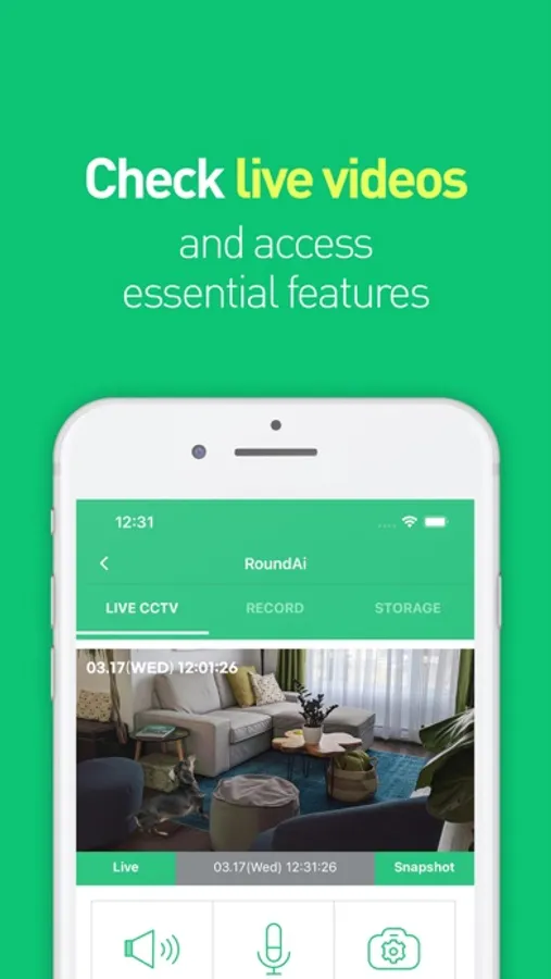 The Round AI is an application that allows you to easily control and utilize a 720-degree home CCTV camera equipped with 2 fisheye lenses. After installing the Round AI app on your smartphone, you can check recorded videos along with the real time live videos by connecting the camera to the internet via WiFi. You can also easily share recorded videos and images using the export function.