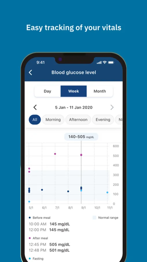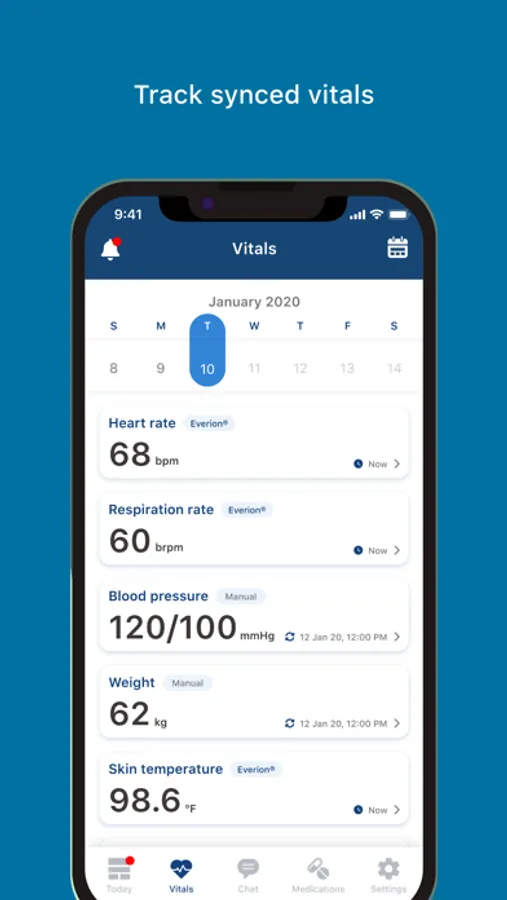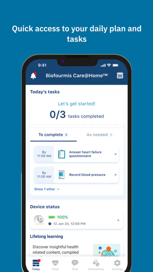 The Biofourmis Care@Home™ patient-facing app is designed to improve patient engagement, display vital signs, and enable communication between patients and the care team. When the patient or clinician has connected the application to connected devices via Bluetooth, the outputs from these connected devices will automatically be displayed in the mobile app.