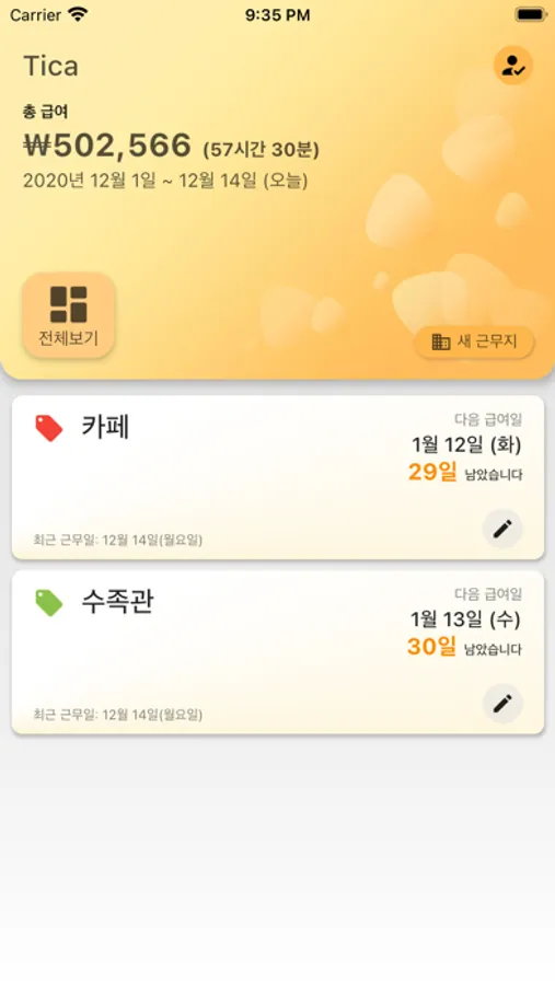 Tica의 직관적인 인터페이스와 자동 급여 계산을 통하여 알바 시간 기록과 급여를 쉽고 간편하게 관리 하실 수 있습니다.