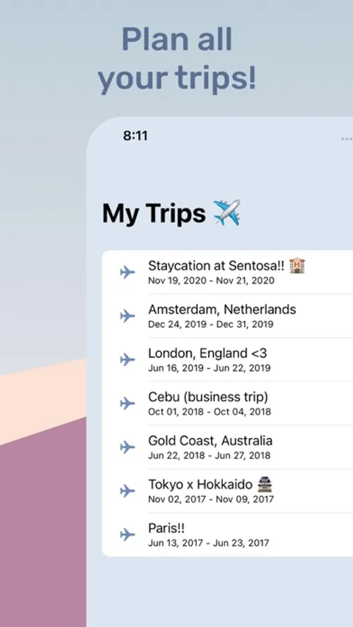 Triplanner is a planning app to assist users in planning for their vacations and staycations. Users can organise their trips, plan out their itinerary, keep track of their budget and ready their packing list!