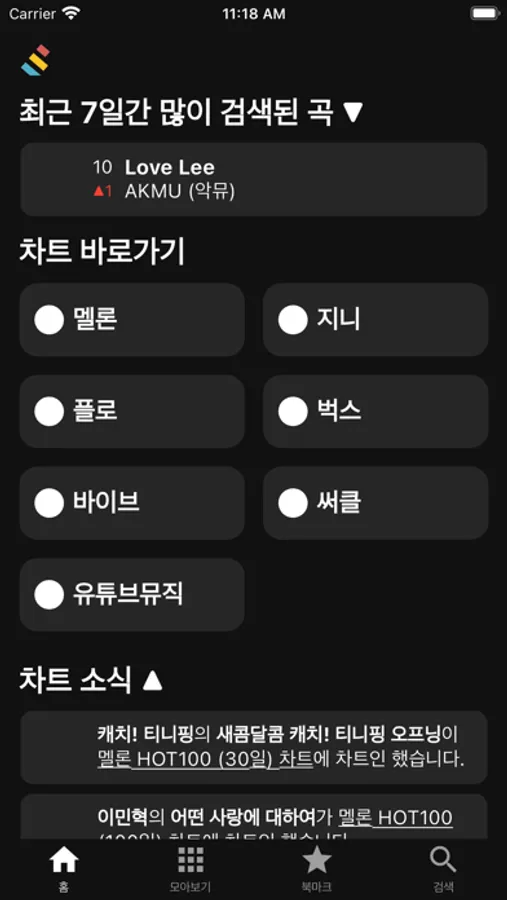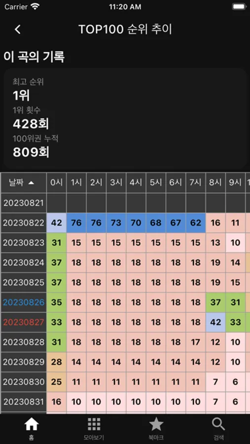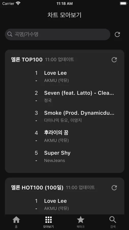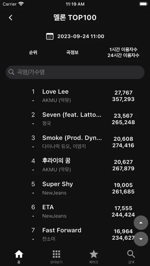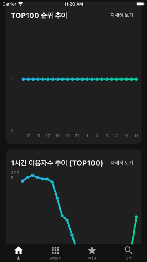 실시간 차트, 일간 차트, 순위 추이 등 다양한 차트들을 볼 수 있습니다.