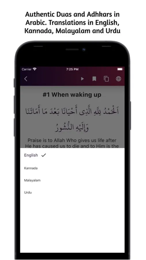 • Arabic with transliteration, English, Malayalam, Kannada and Urdu translations.