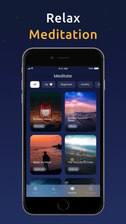 - Guided meditations on subjects like Beginners, Anxiety, Focus and Sleep