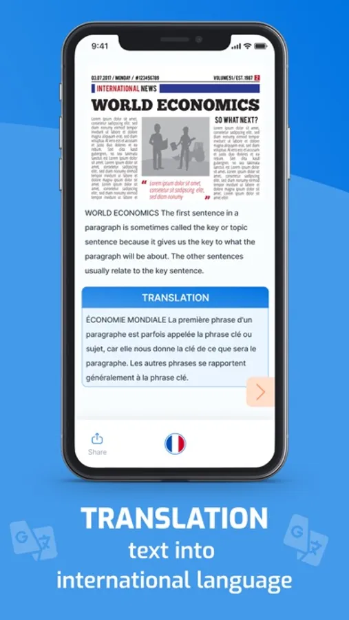 - Multi-sharing: share scanned documents or translated texts with friends and family, print, and send translations via email or text message.
