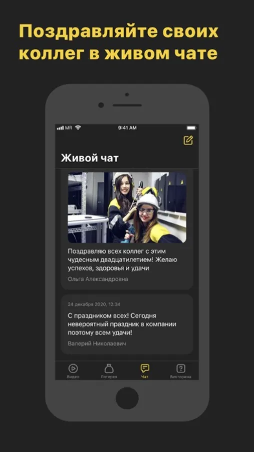 - чат, где сотрудники могут писать поздравления, выкладывать памятные фото из своей коллекции;