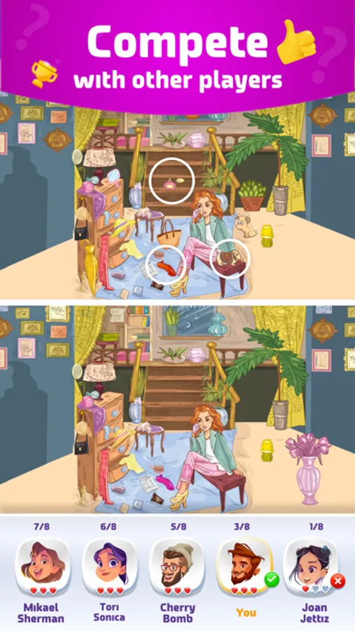 Welcome to Find Differences Online! It is a type of puzzle game where the main goal is to find all the differences between the two versions of the same picture which are shown side by side. Also, during the game you should compete with other participants and try to beat them all using special abilities!