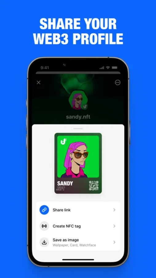 Share your Web3 profile and NFT domain with your friends. Download a digital card with your NFT profile photo for your lock screen, watch face, or social media.