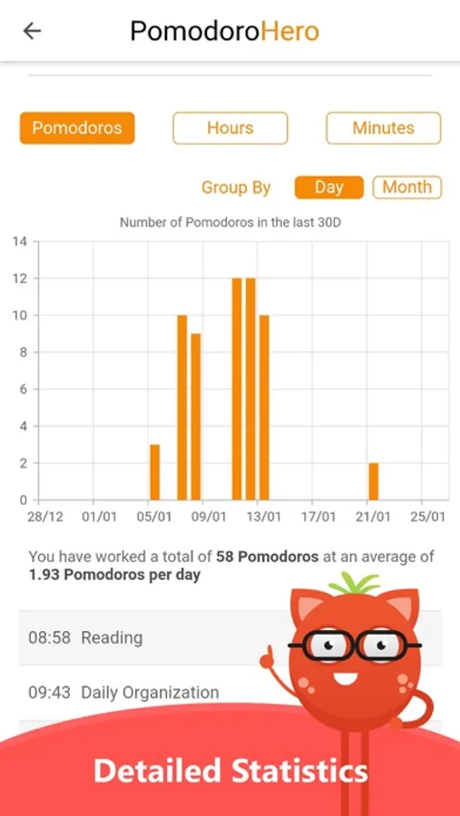 Pomodoro Hero will keep track of your completed sessions so you can analyse these later in an easy way with our built-in charts