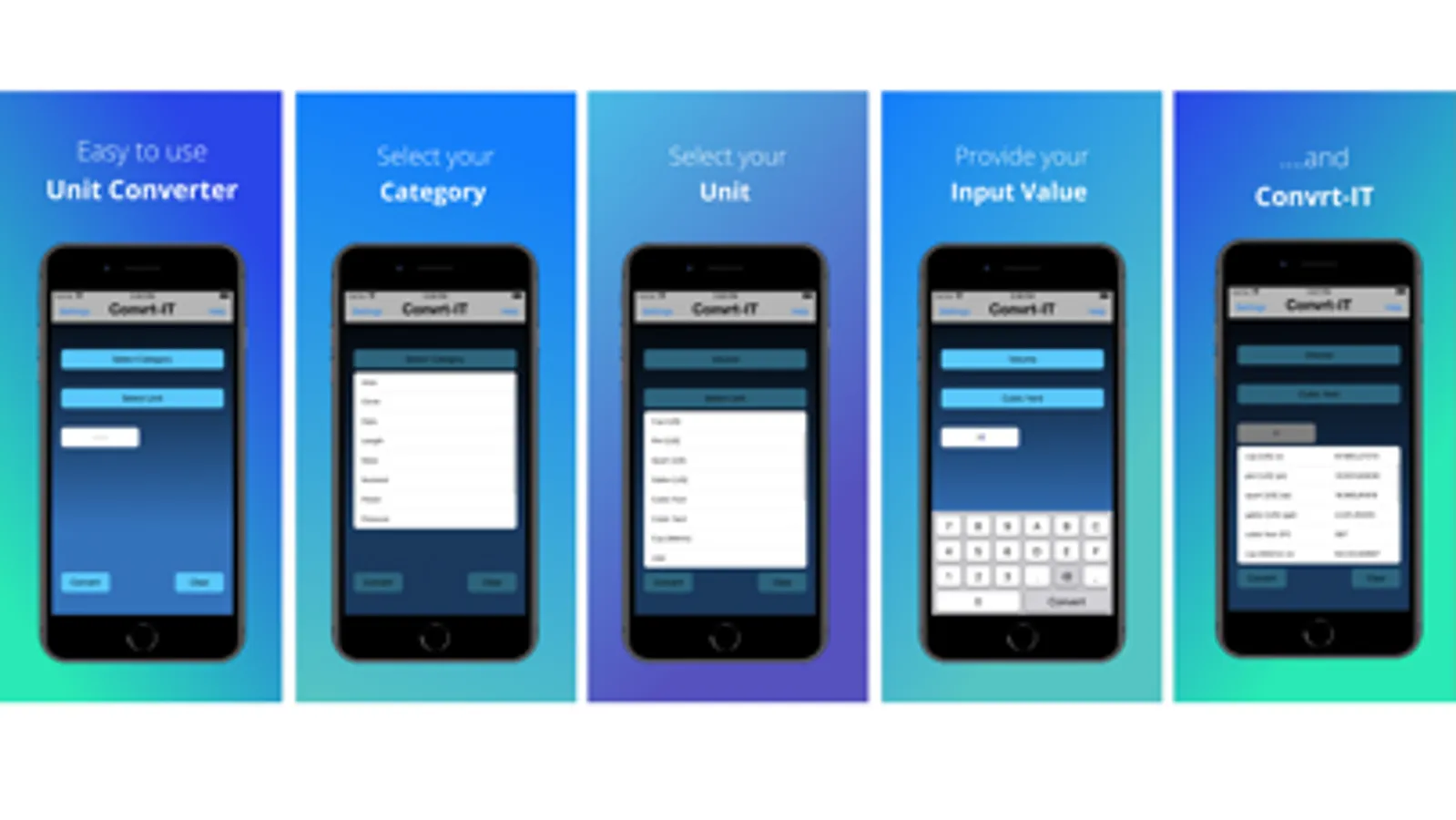 After selecting a category and an associated unit an input value has to be provided. Once input has been provided and the “Convert" button has been clicked, the keyboard will be dismissed, and the conversion results will be listed in a table underneath the input field. The selected category and unit will appear as the button title.