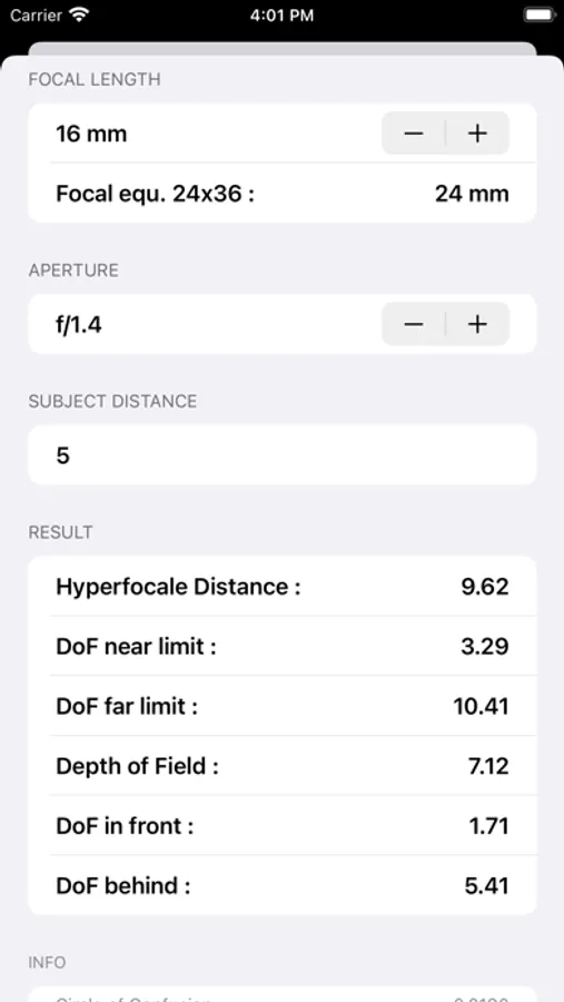 A depth of field calculator is integrated.