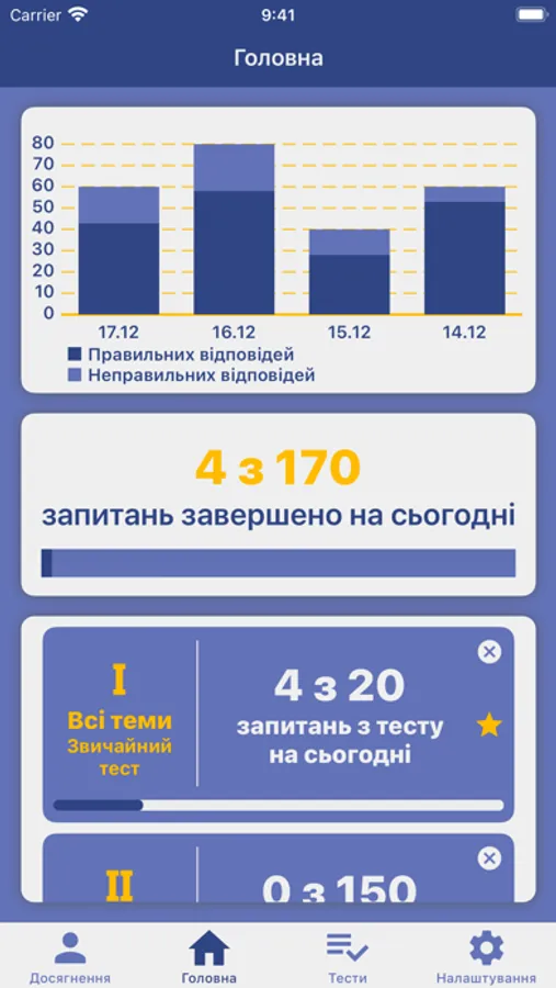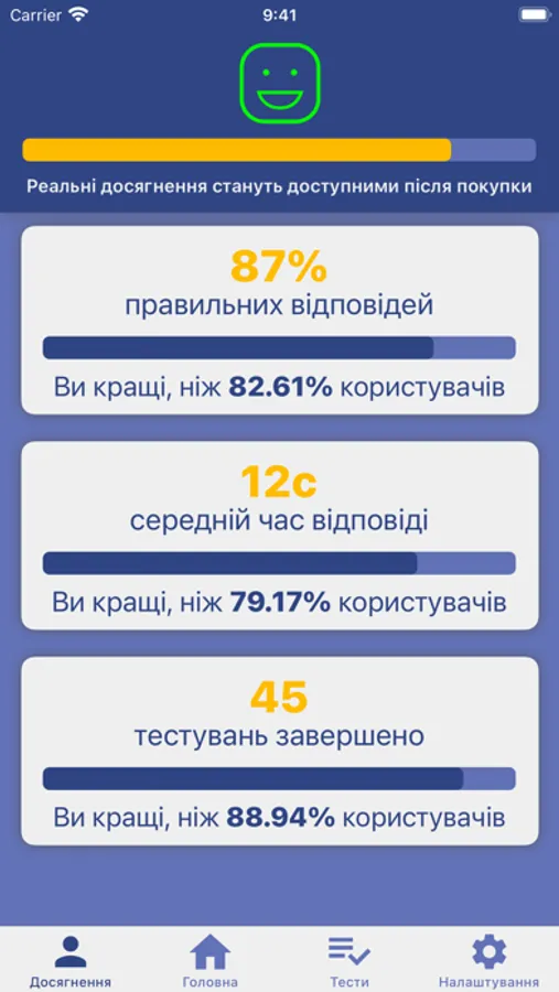 В цьому додатку Ви зможете не тільки вивчати матеріал і проходити тести, але і побачити порівняння Ваших результатів із результатами інших користувачів, що проходять тестування.