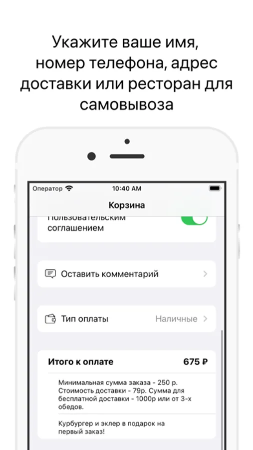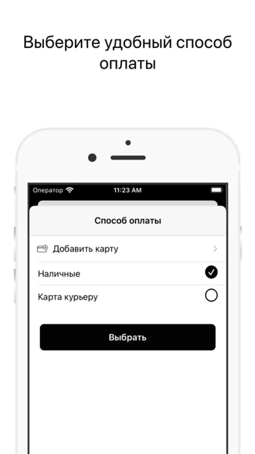 Выберите способ оплаты: Наличными или картой. Примите правила оплаты и нажмите кнопку “Заказать”.
