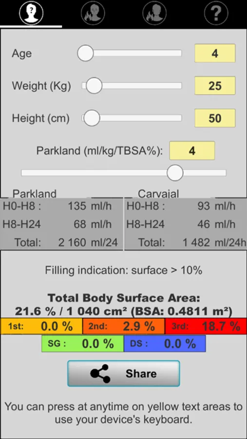 Application aimed at guiding initial fluid management (adults and children) after drawing the burned surface on a template (Lund and Browder chart).