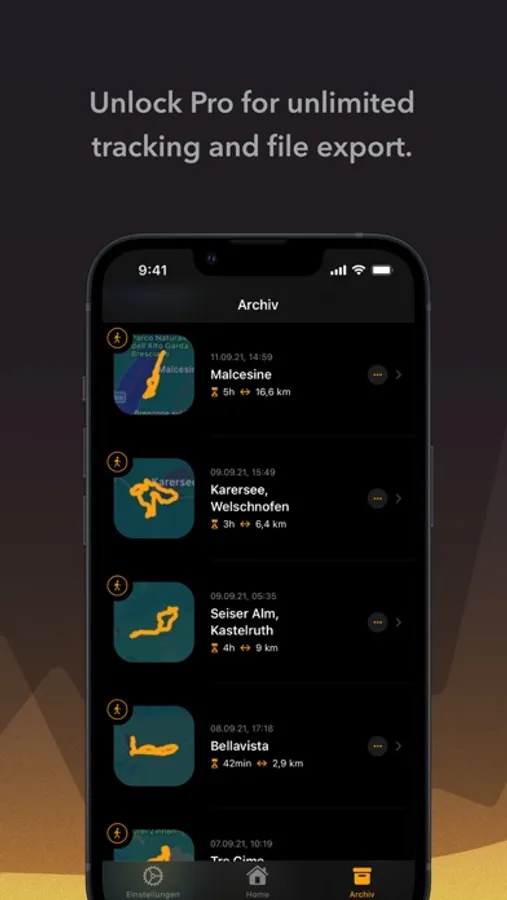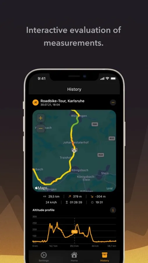 You can share the recorded data directly with other apps or send it to friends (as long as they support .gpx import). Of course, the file export also allows further analysis and data processing of your measurements outside of iOS. For the data export, you have the option to choose between the optimized elevation profile and the pure GPS data.
